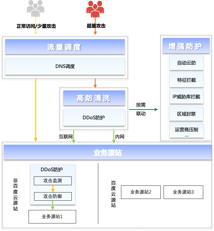 在业务遭受超量DDoS攻击时,会导致网络延时上升、服务器资源耗尽、服务中断、客户流失等严重后果。百度安全DDoS防护服务基于对流量的分析、学习和预测,建立起业务流量模型,具备毫秒级攻击监测、秒级联动防御等领先优势,可提供更智能、更高效的DDoS防护服务。并行业首创可根据攻击类型的智能切换防御方案,当业务遭受攻击时,仍拥有良好的访问体验。无论是重大活动期间的攻击预防,还是高风险业务中的日常稳定加固,百度安全DDoS防护服务都可以用于保障相关活动的网络安全、保障高风险业务的稳定。