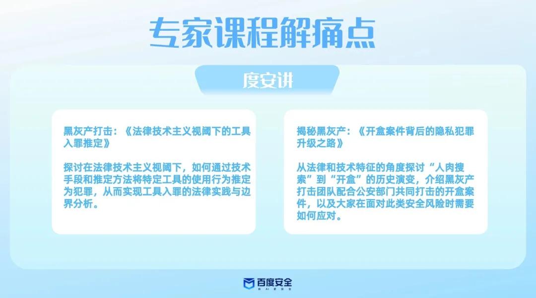 专家课程解痛点:紧扣《数据安全法》《个人信息保护法》合规要求,涵盖反诈防骗、信息保护、黑灰产揭秘等核心主题,更可针对不同行业特性定制专属方案,精准解决个性化安全诉求。