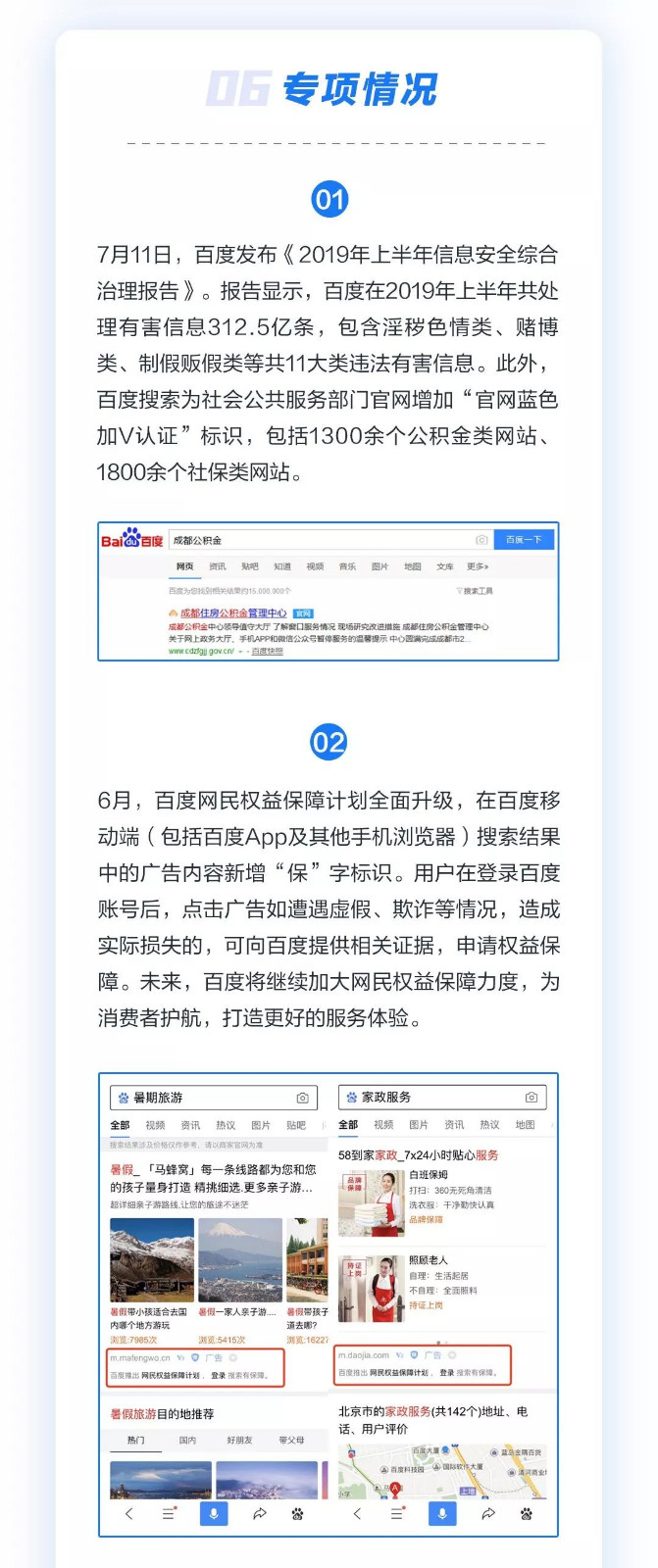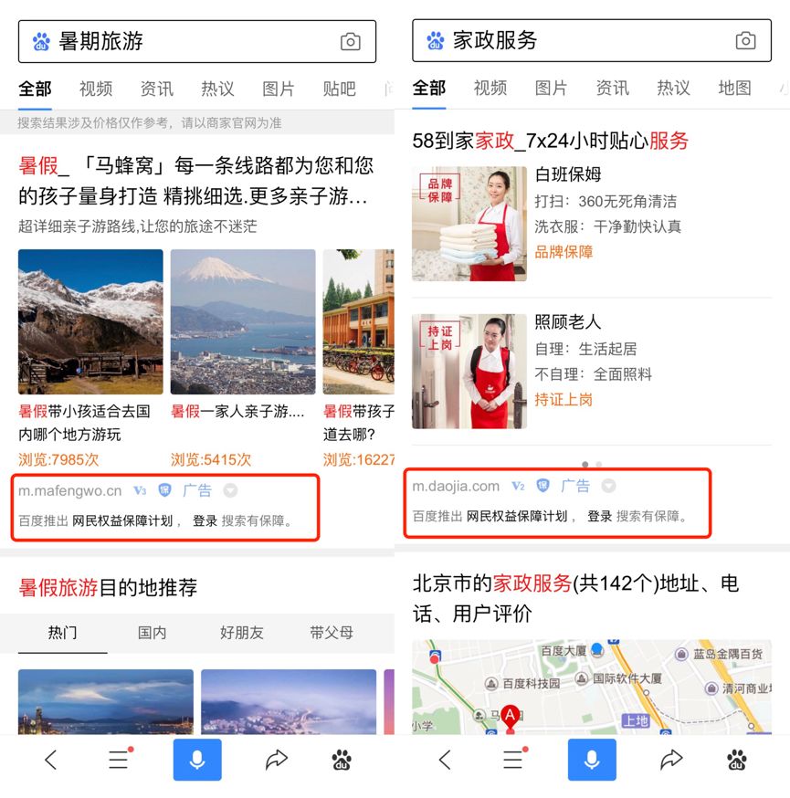 此外,百度网民权益保障计划全面升级,在百度移动端(包括百度 APP 及其他手机浏览器)搜索结果中的广告内容新增“保”字标识。用户在登录百度账号后,点击广告如遭遇虚假、欺诈等情况,造成实际损失的,可向百度提供相关证据,申请权益保障。