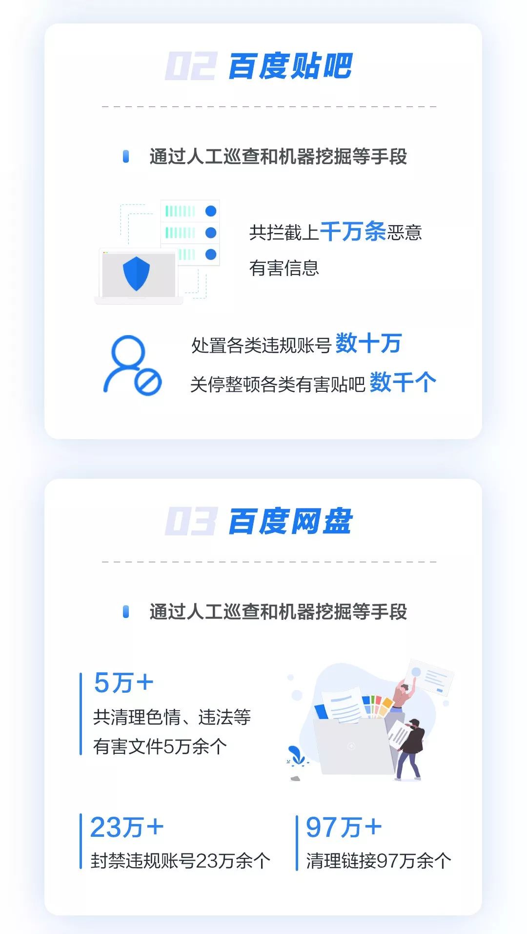 2019年6月,百度内容安全中心通过全方面手段,人工巡查侵权、色情等相关有害信息577.4万余条;利用人工智能技术挖掘打击色情、赌博等相关有害信息32亿余条。