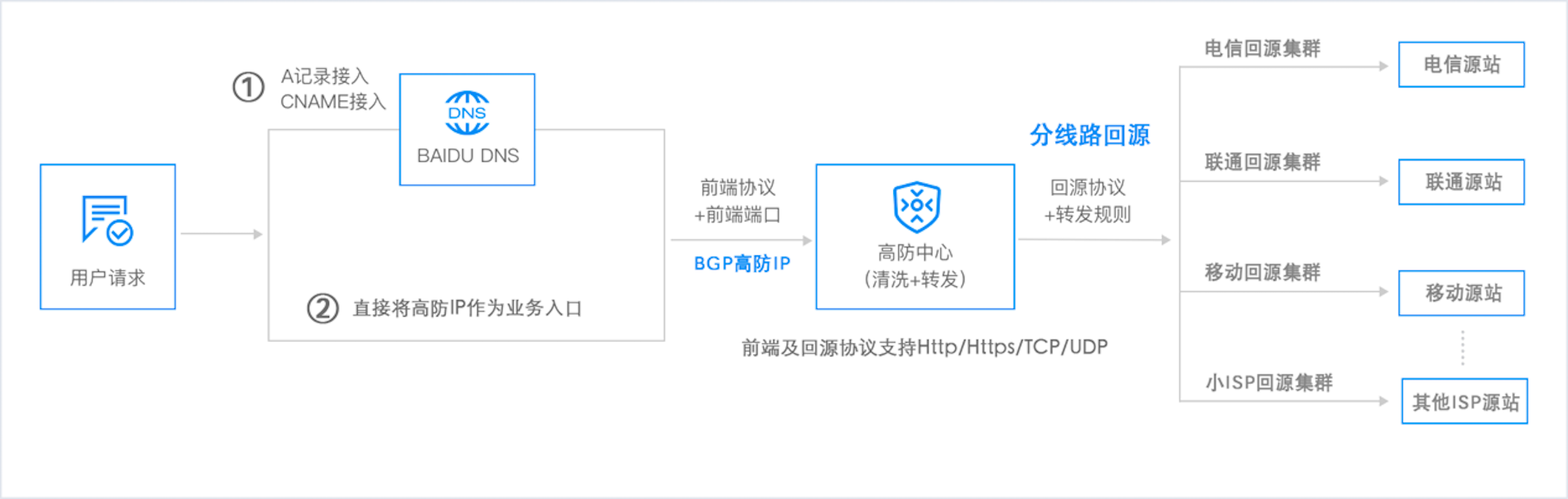 采用替身式云防护模式,只需切换DNS到分配的高防IP或Cname地址,即可接入使用。同时支持七层Http/Https网站域名类和四层TCP/UDP端口类业务防护